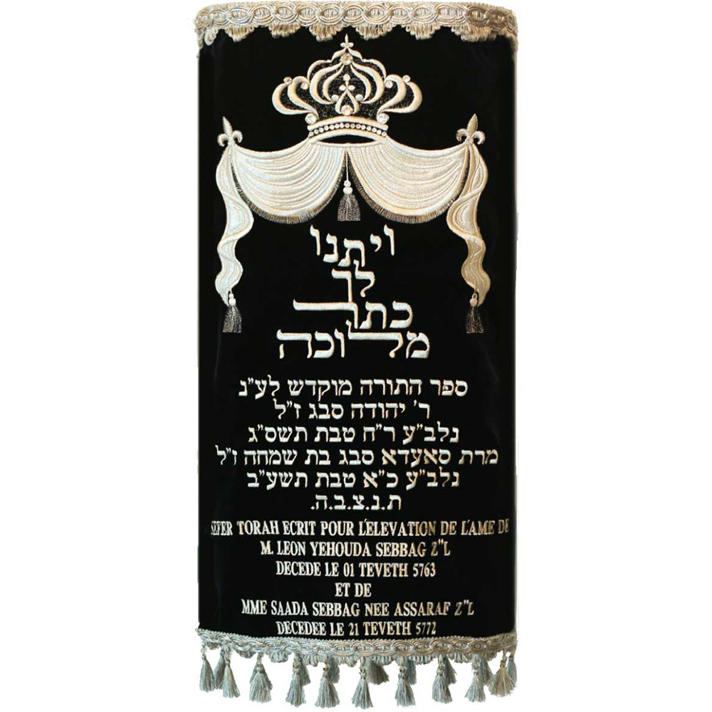 מעיל יוקרתי רקום לספר תורה עם דוגמא של כתר מעוטר באבני סברובסקי. בשילוב הפסוק "ויתנו לך כתר מלוכה".