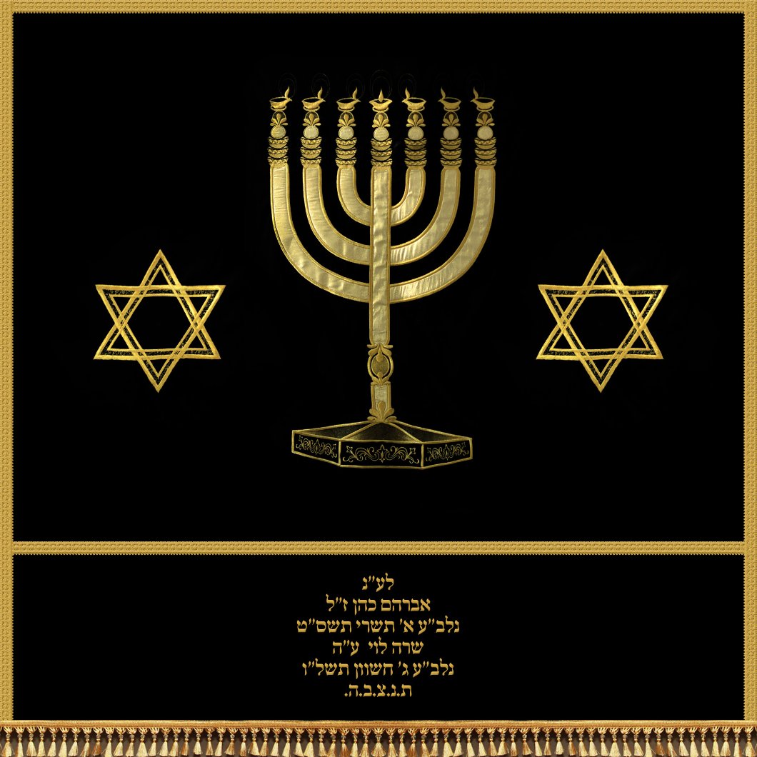 פרוכת יוקרתית רקומה לבימה בבית הכנסת עם דוגמא של המנורה ומגני דוד.