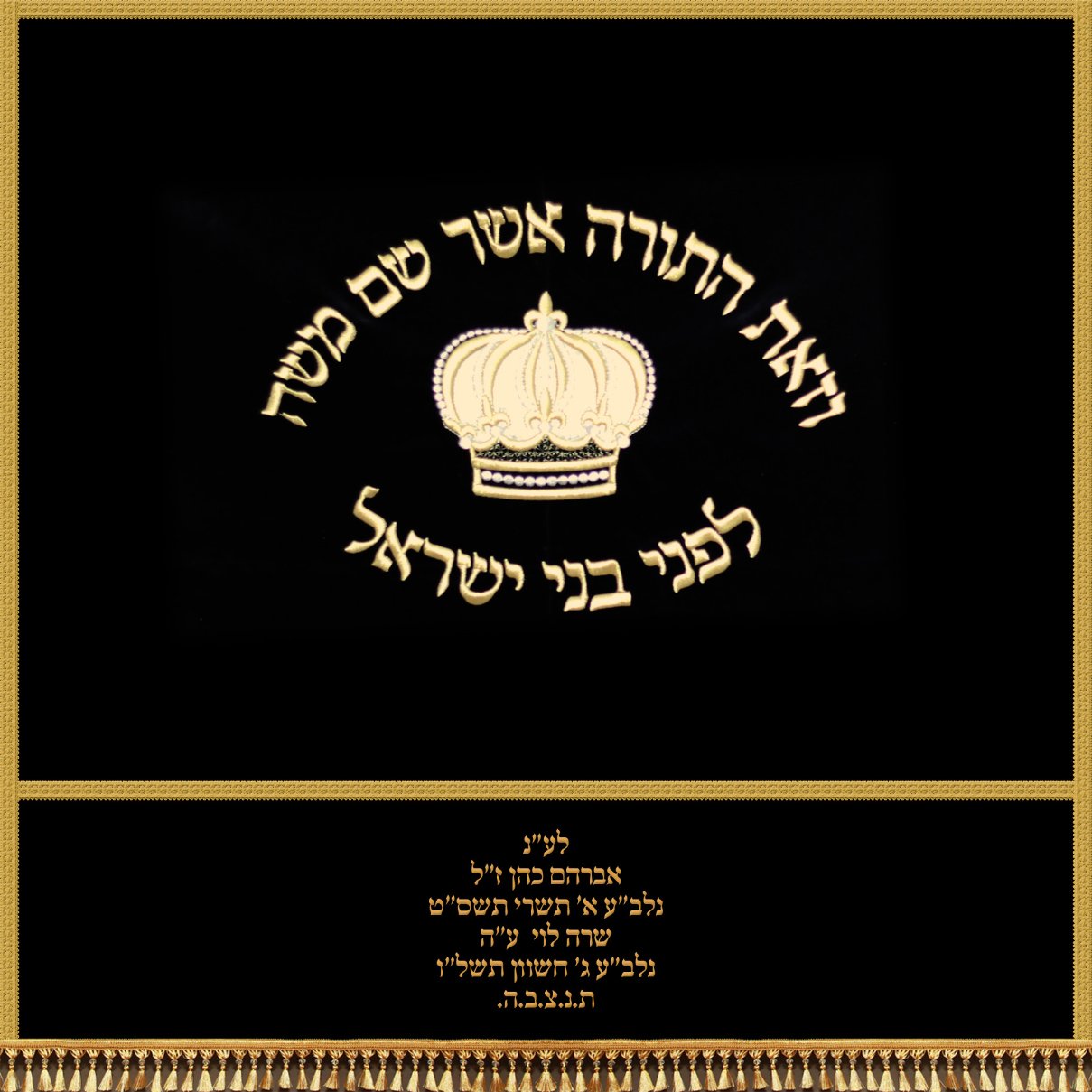 פרוכת יוקרתית רקומה לבימה בבית הכנסת עם דוגמא של כתר. בשילוב הפסוק "וזאת התורה אשר שם משה לפני בני ישראל".
