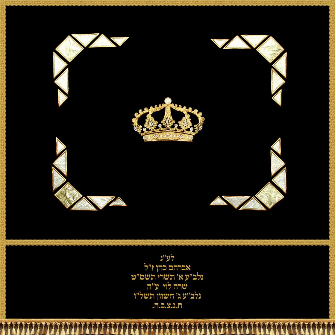 פרוכת יוקרתית רקומה לבימה בבית הכנסת עם דוגמא של כתר ומעויינים רקומים.