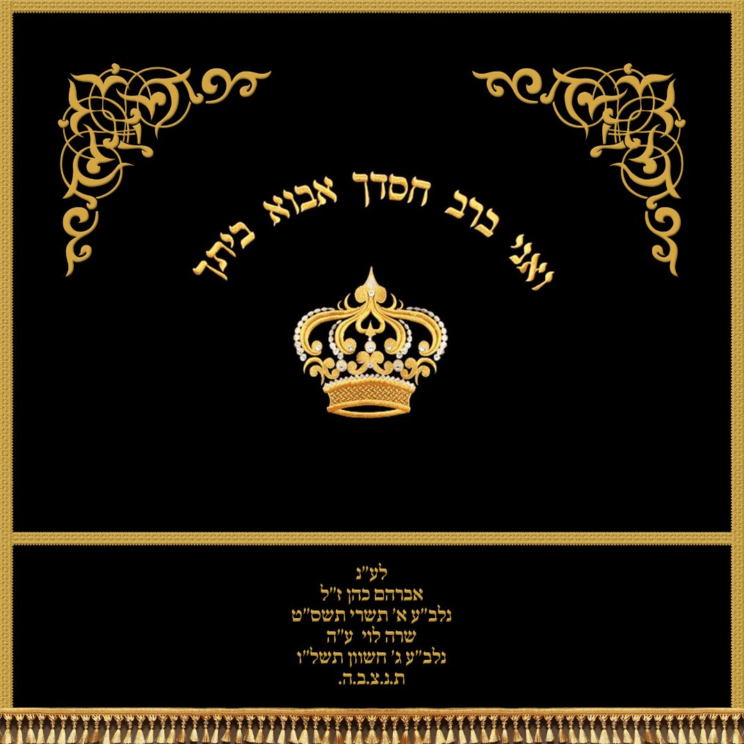 פרוכת יוקרתית רקומה לבימה בבית הכנסת עם דוגמא של כתר ועיטורים בזהב. בשילוב הפסוק "ואני ברב חסדך אבוא ביתך".