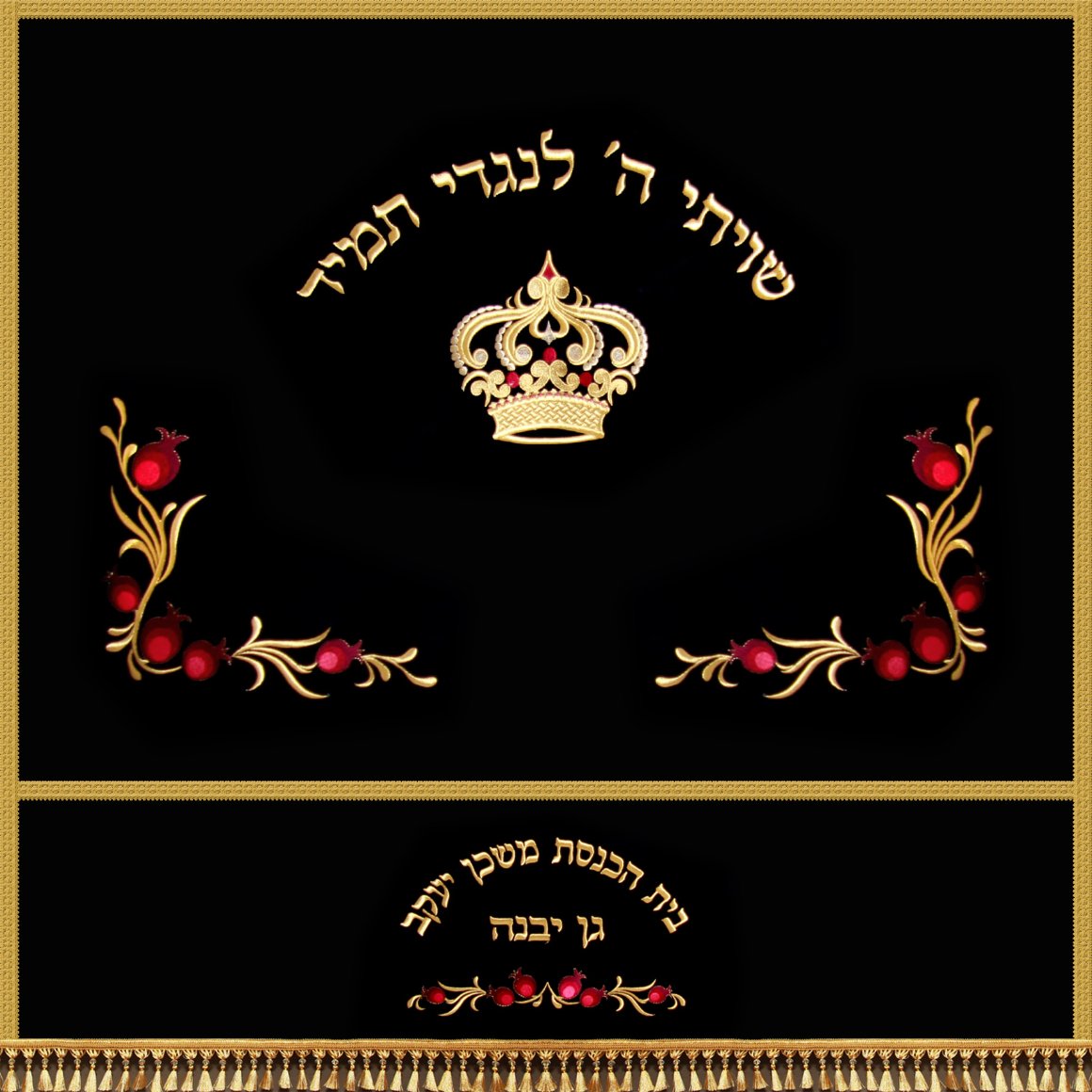 פרוכת יוקרתית רקומה לבימה בבית הכנסת עם דוגמא של כתר, רימונים ועיטורים. בשילוב הפסוק "שויתי ה' לנגדי תמיד".