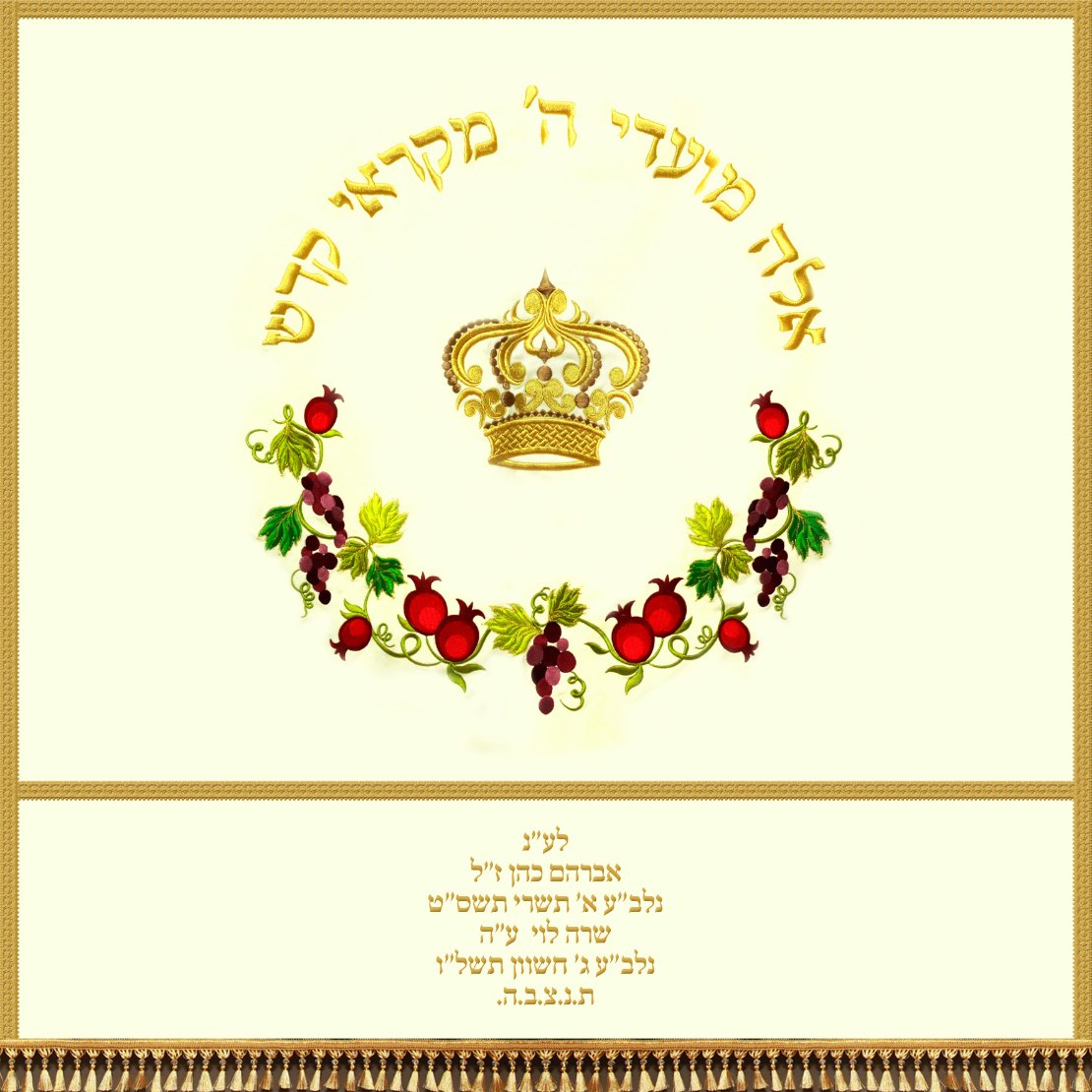 פרוכת יוקרתית רקומה לבימה בבית הכנסת עם דוגמא של כתר ושבעת המינים. בשילוב הפסוק "אלה מועדי ה' מקראי קודש".
