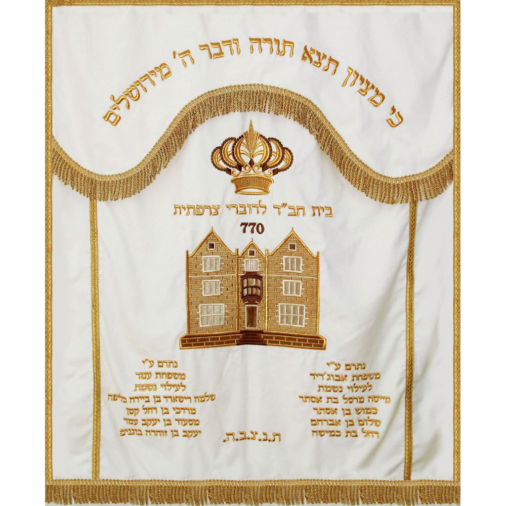 פרוכת רקומה בדוגמת חב"ד – בית הרבי מלובביץ' בשילוב הפסוק "כי מציון תצא תורה".