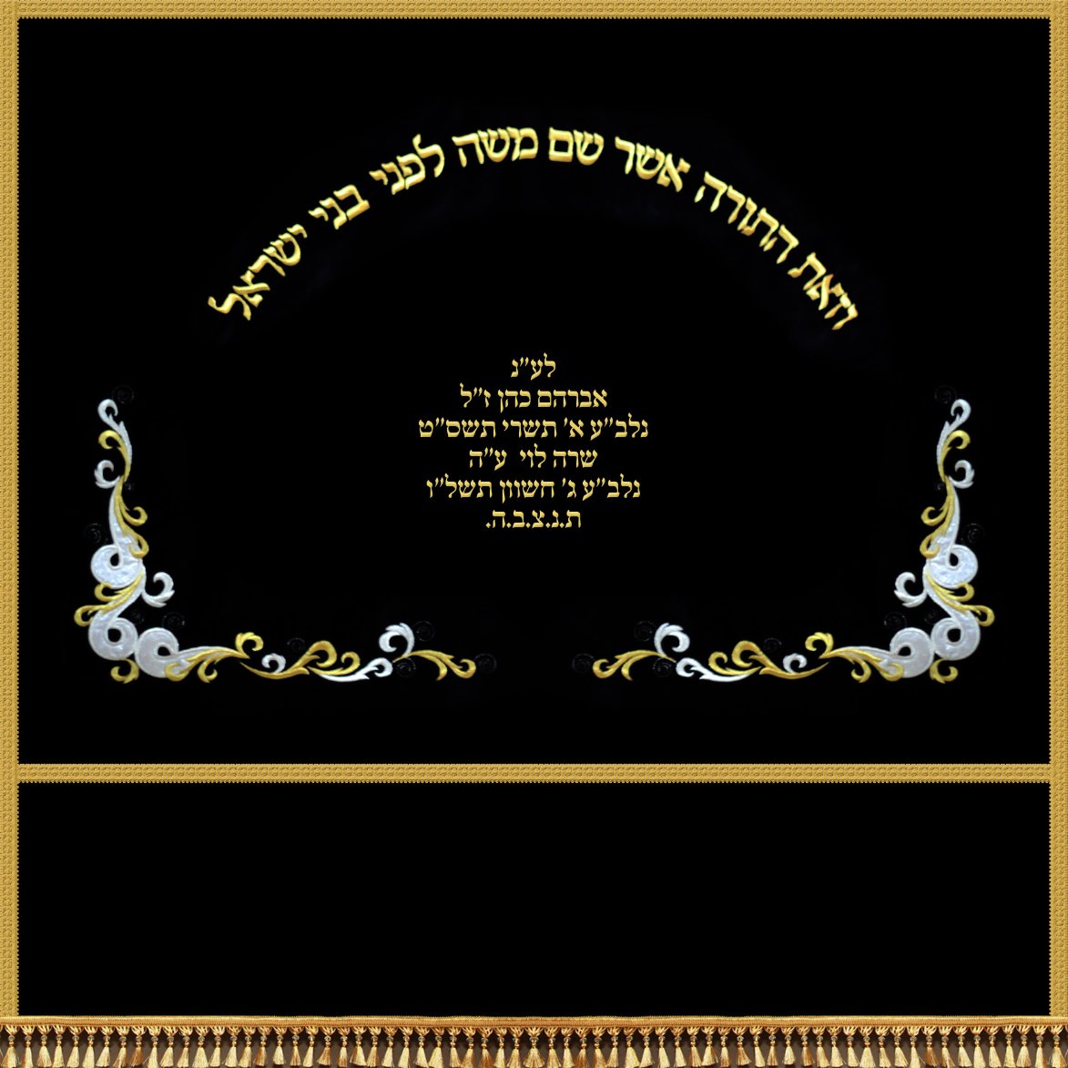 פרוכת יוקרתית רקומה לבימה בבית הכנסת עם דוגמא של עיטורים בגווני זהב וכסף. בשילוב הפסוק "וזאת התורה אשר שם משה לפני בני ישראל".