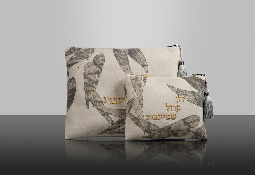 תיק טלית-תפילין בעיצוב אישי דגם Carmi. תיקים מודפסים עם עלי אקליפטוס מהר הזיתים בשיטת הדפסה מיוחדת. בדי התיקים עשויים מאריג משובח עם בטנה מבד ייחודי.